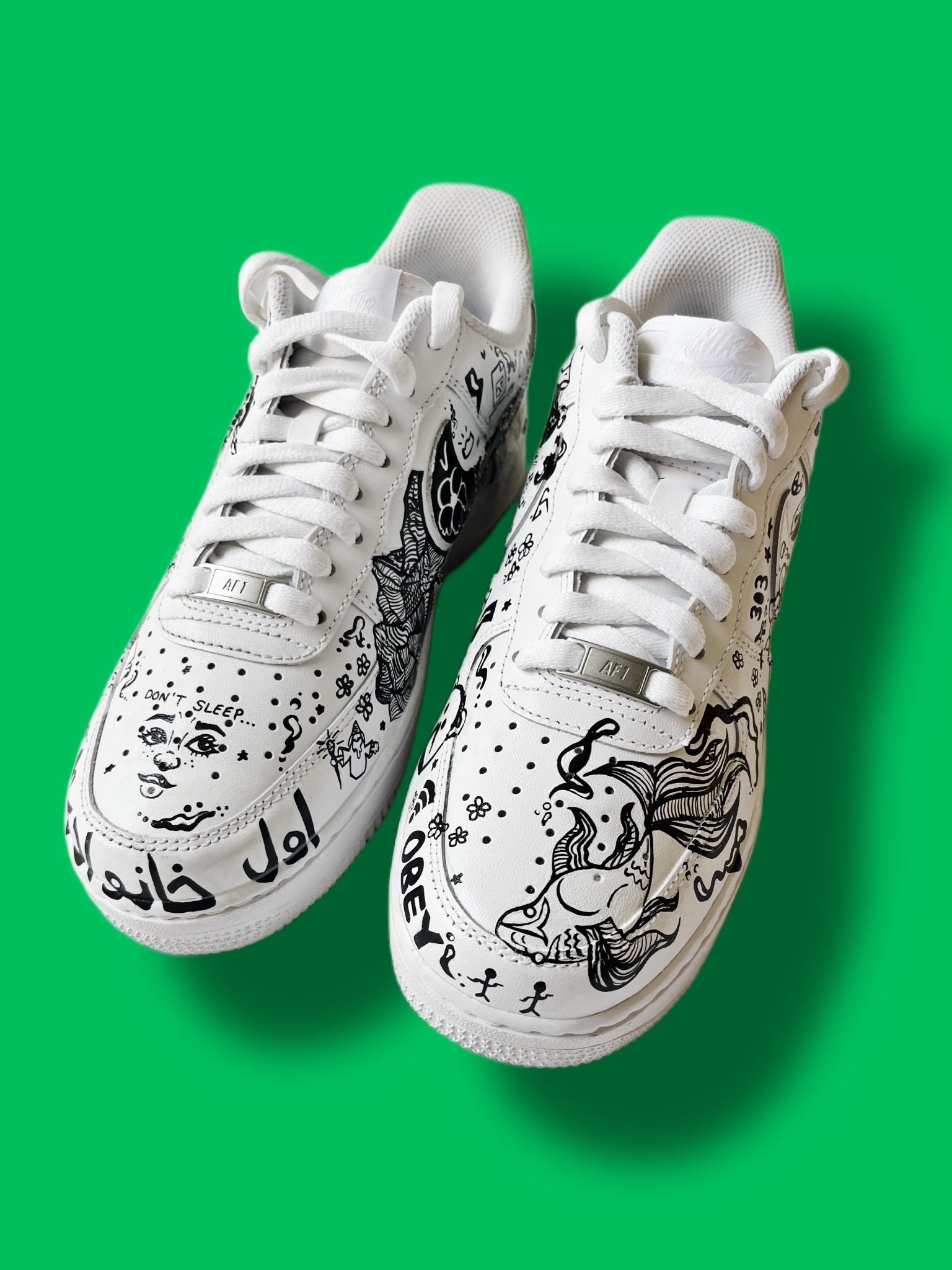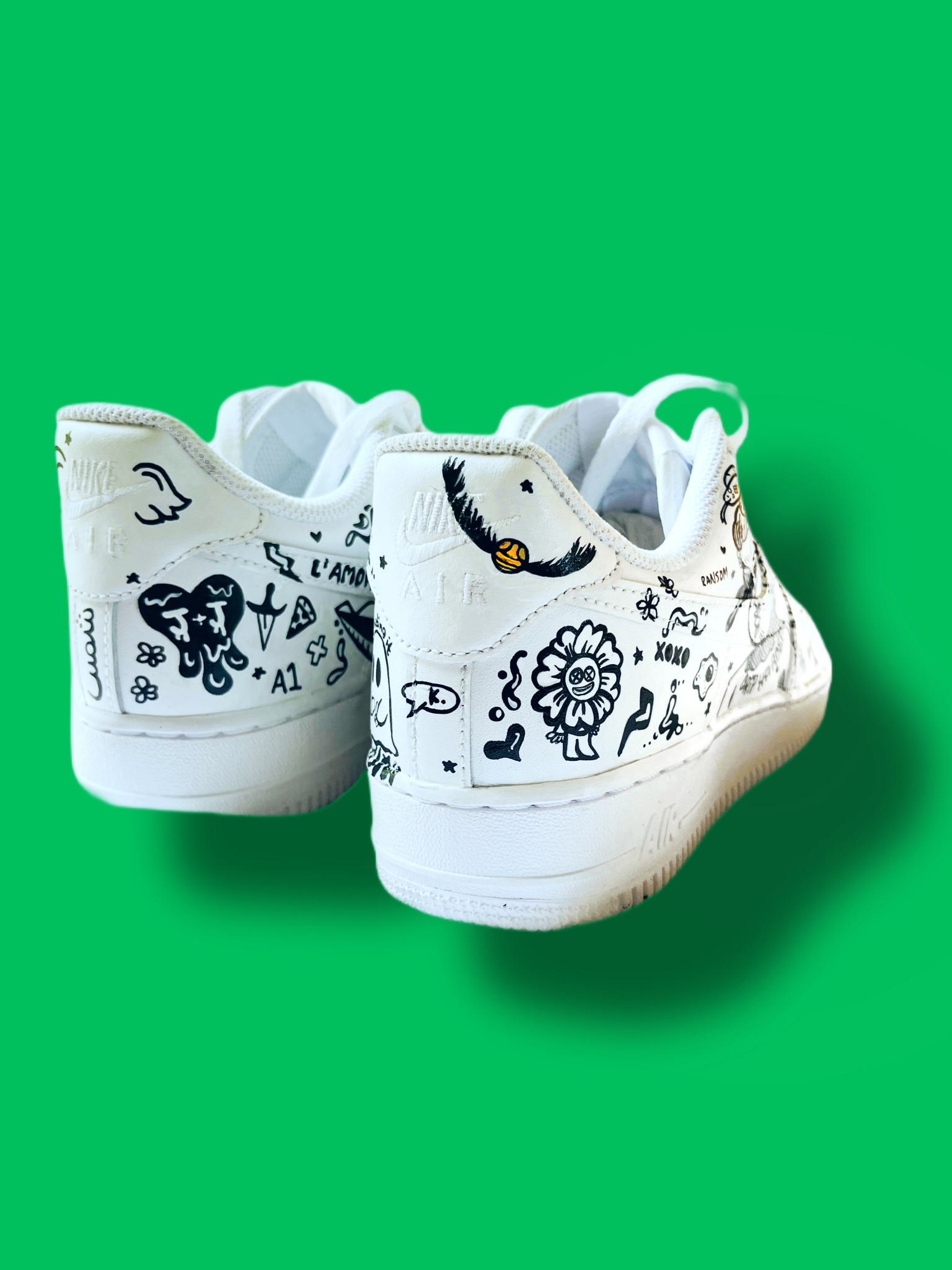 Going from design to kicks is a process that is as client-facing as possible. I like to get a sense of my subject so their shoes can reflect them. This pair was designed in collaboration with the client, featuring personal elements and my designs based on their personality and interests. The result? A unique pair of kicks covered in customized art.